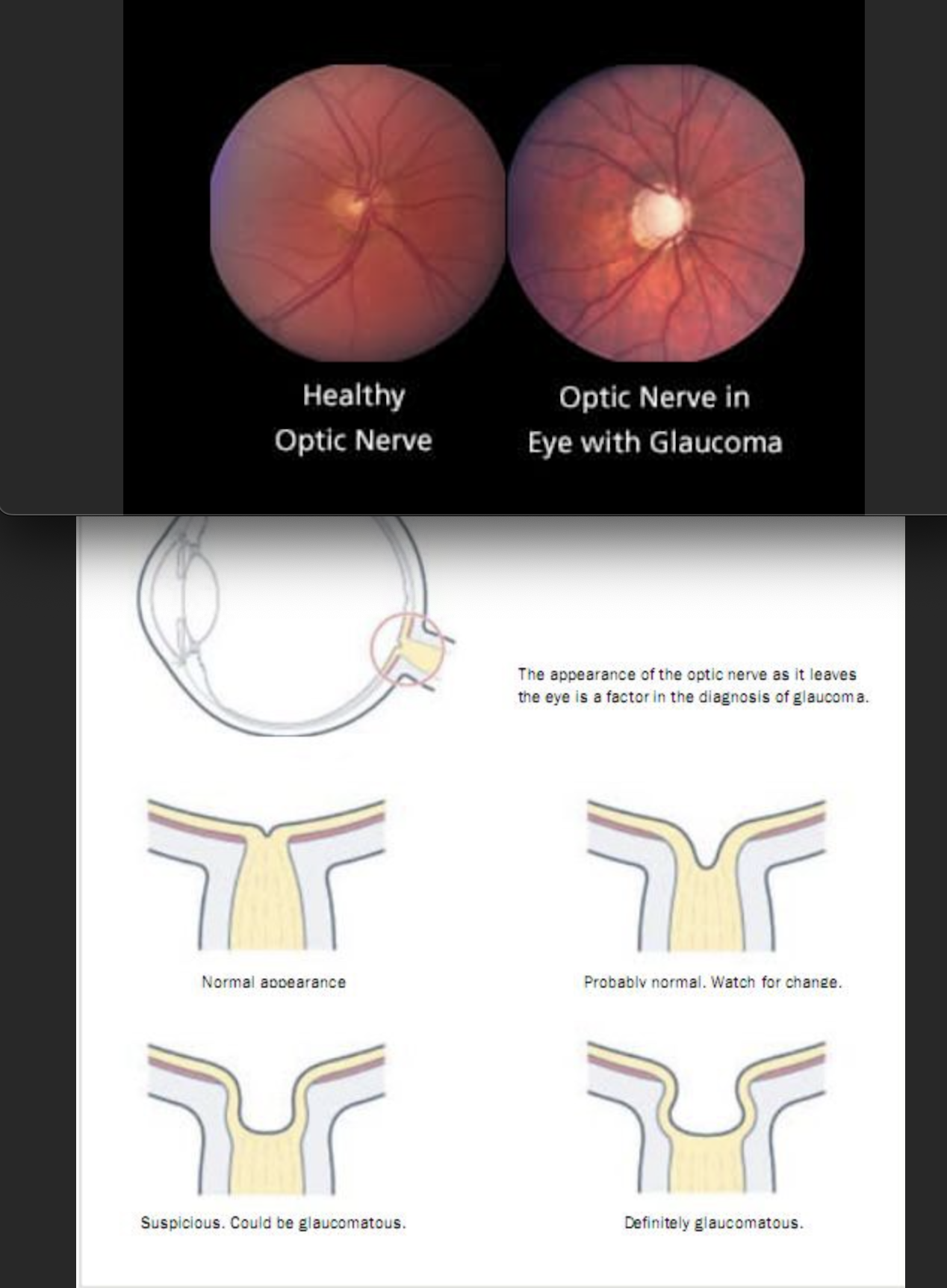 Cupping is a clinical sign of increased IOP seen on fundoscopy. As IOP increases it pushes back on the optic nerve creating a “cup” shape. We see this as the transition from a small flat well rounded circle to a wide high contrast circle.