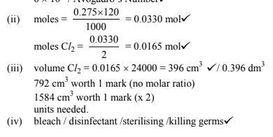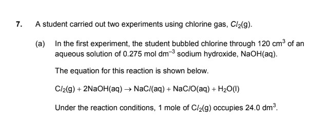 (iii) Calculate the volume of Cl2(g) that was needed to react with the NaOH(aq) used. (2)