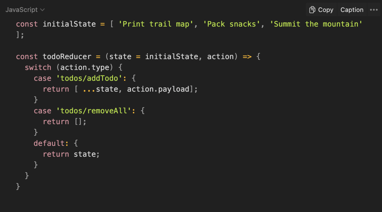 Upon receiving the action object via dispatch(), the store’s reducer function will be called with the current value of getState() and the action object.