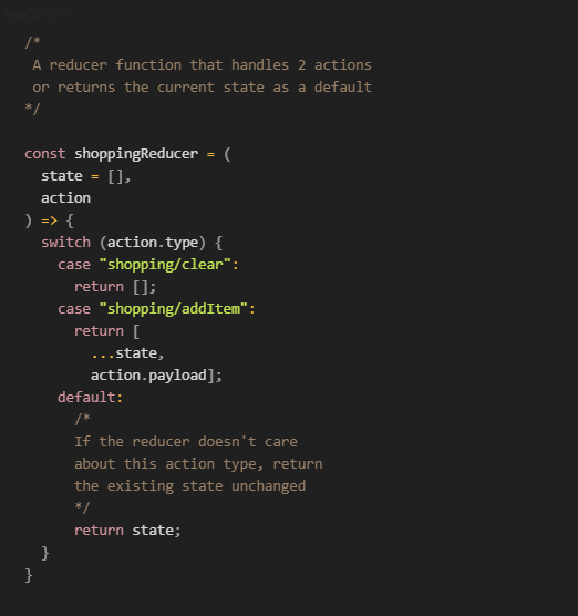 A reducer (also called a reducing function) is a plain JavaScript function that accepts the store’s current state and an action and returns the new state.