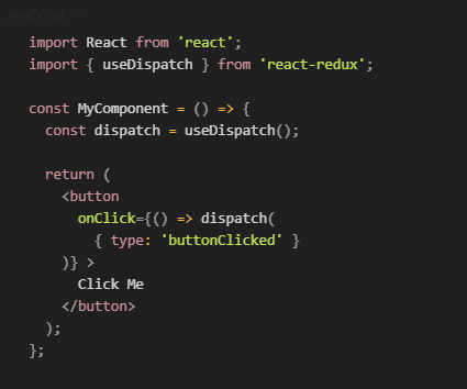 By convention, a React component defines dispatch and assigns the reference returned by useDispatch(). dispatch() can then be used within the component to dispatch action objects.