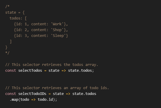 By convention selector function names start with select and describe the data they retrieve from the store.