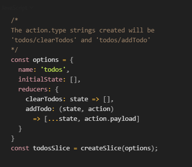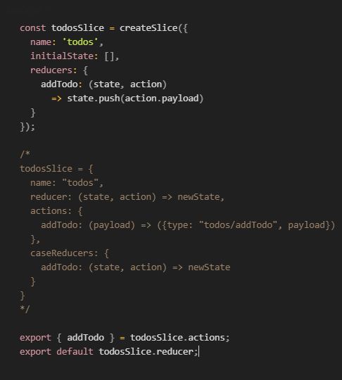 createSlice() returns an object containing a slice reducer (todosSlice.reducer) and corresponding auto-generated action creators (todosSlice.actions).