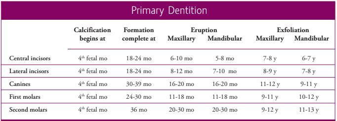 Primary central incisors: Calcification, Formation Complete, Maxillary Eruption, Mandibular Eruption, Maxillary Exfoliation, Mandibular Exfoliation