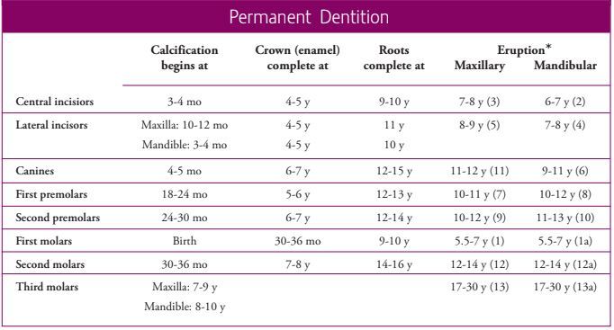 Permanent central incisors: Calcification begins at, Crown (enamel) compete at, Root complete at, Maxillary Eruption, Mandibular Eruption