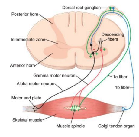 Branch of fibre goes directly to ventral horn of grey matter of spinal cord where it synapses with an anterior motor neuron and sends motor nerve fibres back to the same muscle where the muscle spindle fibre originated from.