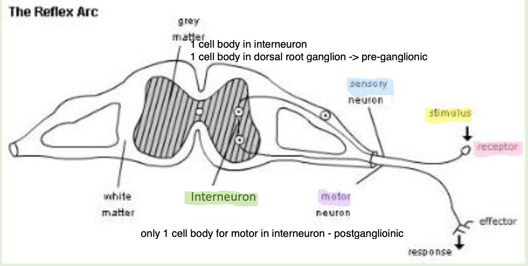- 2 cell bodies; 1 in interneuron and another one in dorsal root ganglion