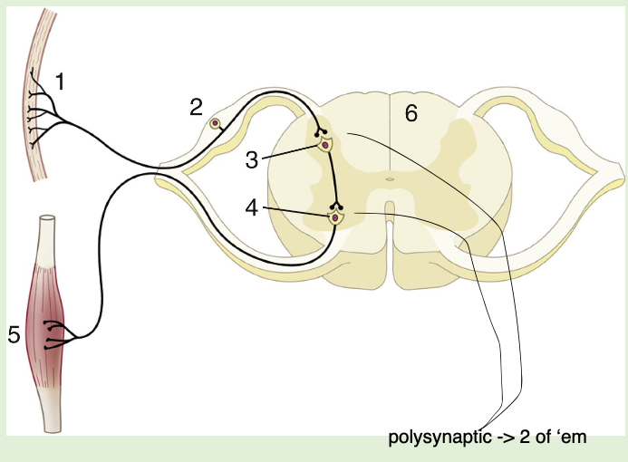 (polysnaptic still a reflex just a couple of passing of batons within spinal cord (STILL NOT BRAIN INVOLVED); - just a response that becomes brain invovled; nerves to spinal cord and back out a..)