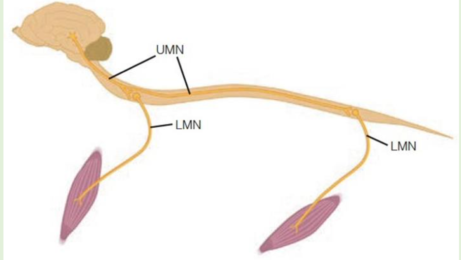 LMN = motor neuron in the peripheral nervous system that connects directly to the muscle; originates in the gray matter of the spinal cord in the reflex arc area