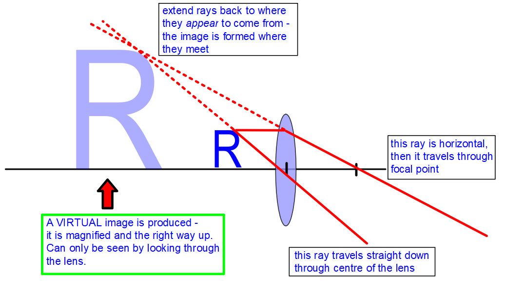 The diagram shows a magnifying glass used to produce a virtual image.