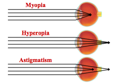 Describe where the image is focused in myopia, hyperopia and astigmatism.