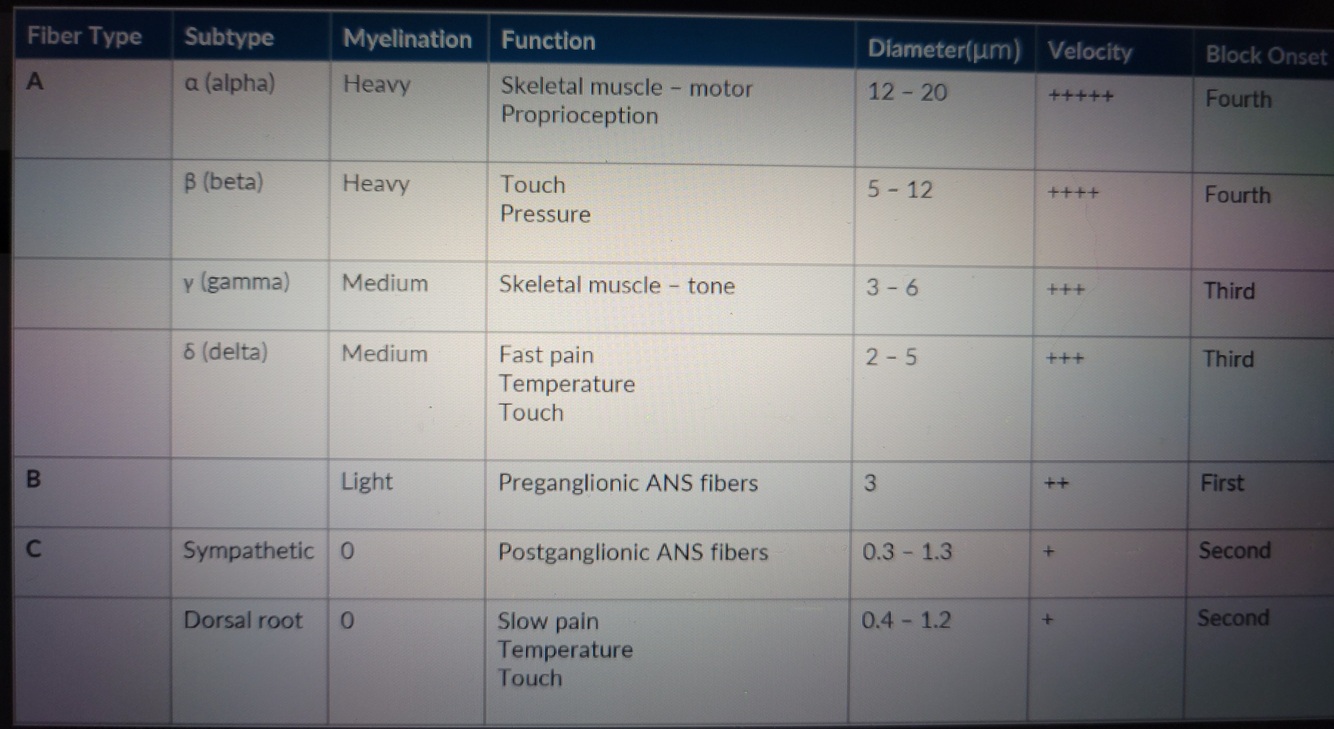 Compare and contrast nerve fibers in terms of subtype, myelination, function, size, conduction velocity, and block onset.