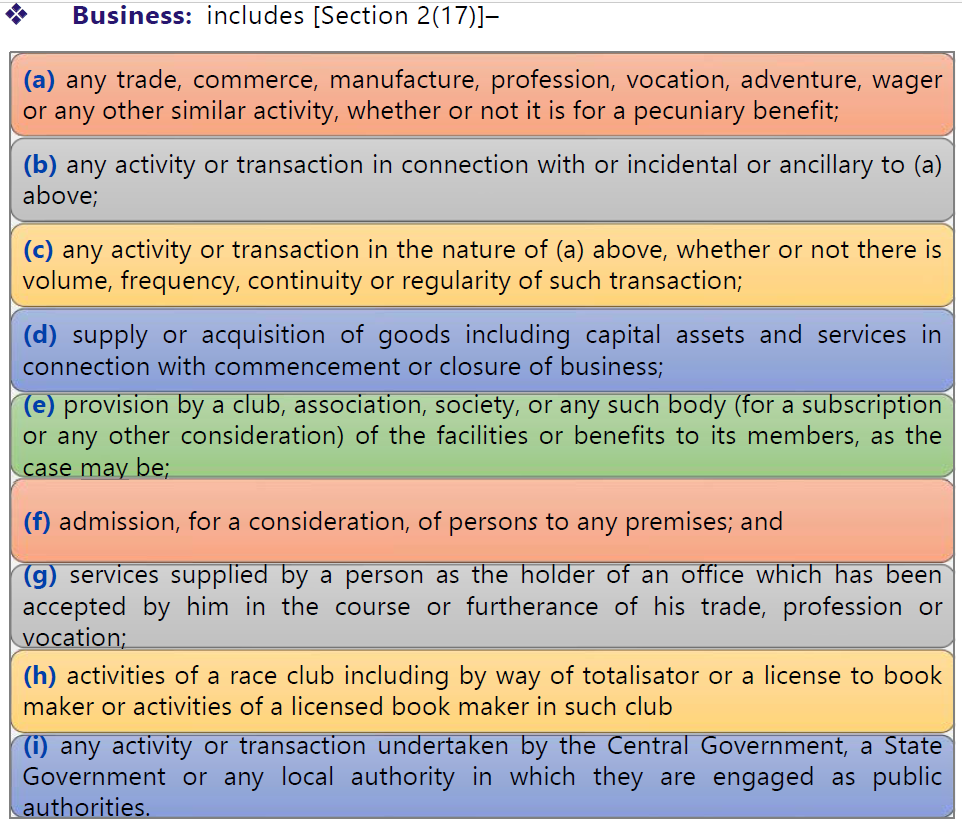 What is the definition of business as per the provisions of section 2(17) of the act?