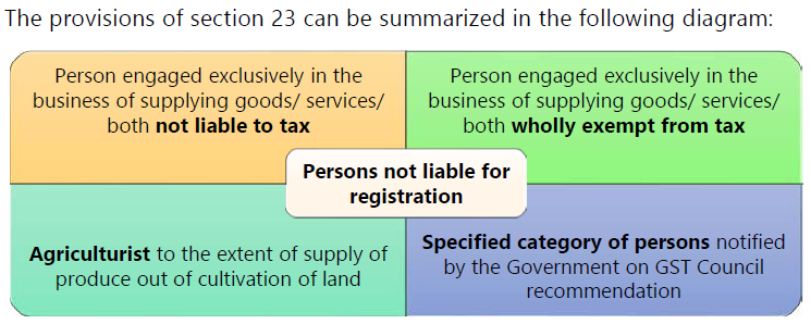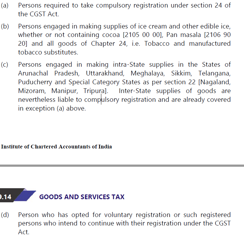 Further, Notification No. 10/2019 CT dated 07.03.2019 exempts any person who is engaged in exclusive supply of goods and whose aggregate turnover in the financial year does not exceed ` 40 lakh, from registration requirement. Exceptions to this exemption are as follows: