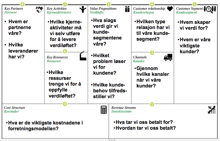 Value proposisjonene: Samlingen av produkter og tjenester en bedrift tilbyr å møte behovene til sine kunder. Ifølge Osterwalder, (2004), er et selskaps verdi forslag hva som skiller seg fra konkurrentene. Verdien proposition gir verdi gjennom ulike elementer som newness, ytelse, tilpasning, “få jobben gjort”, design, merkevare / status, pris, kostnadsreduksjon, risikoreduksjon, tilgjengelighet og brukervennlighet / brukervennlighet.