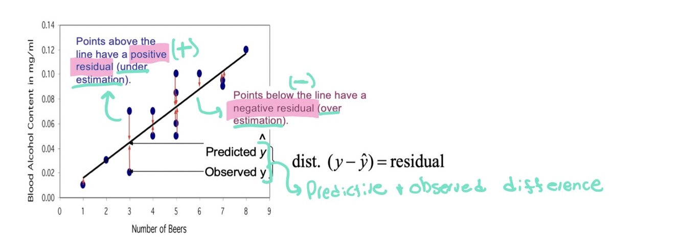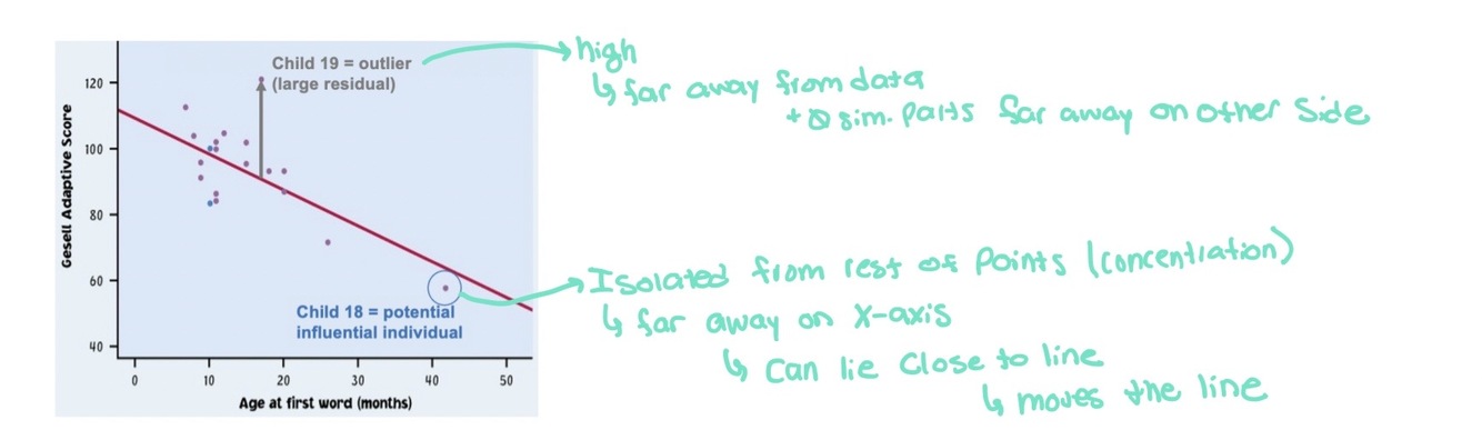 Outlier: An observation that lies outside the overall pattern. (it is unusually far from the regression line, vertically). - large residual