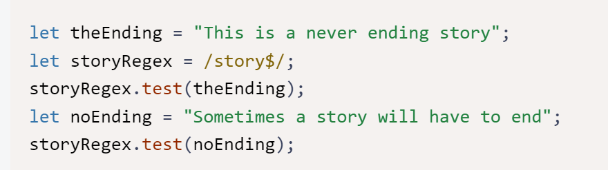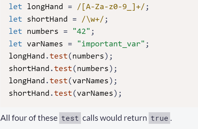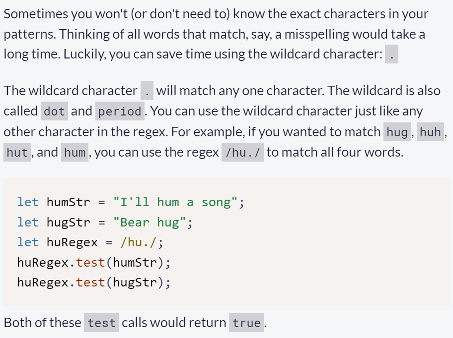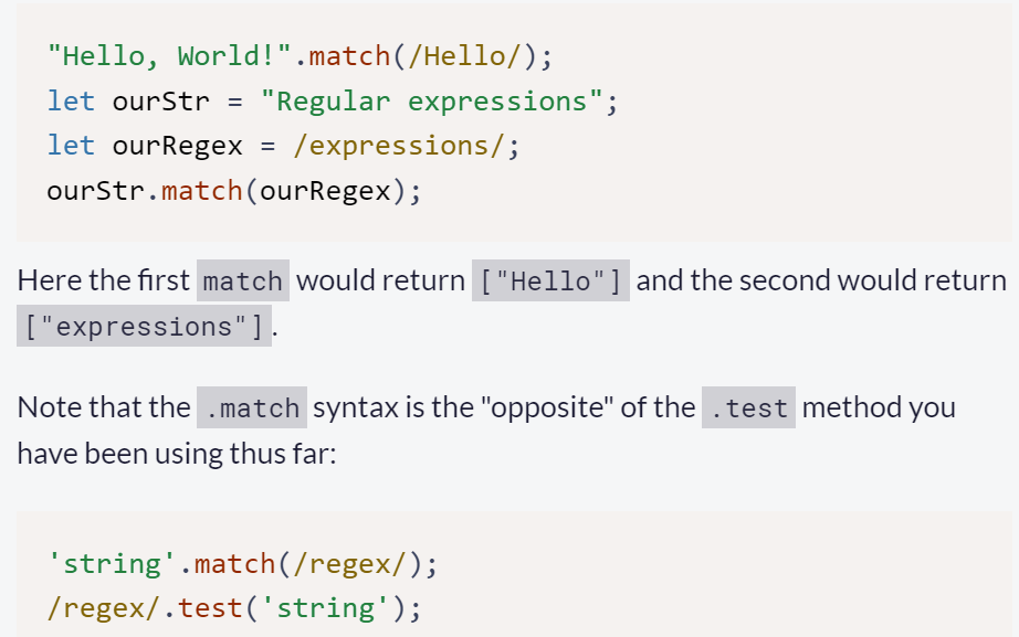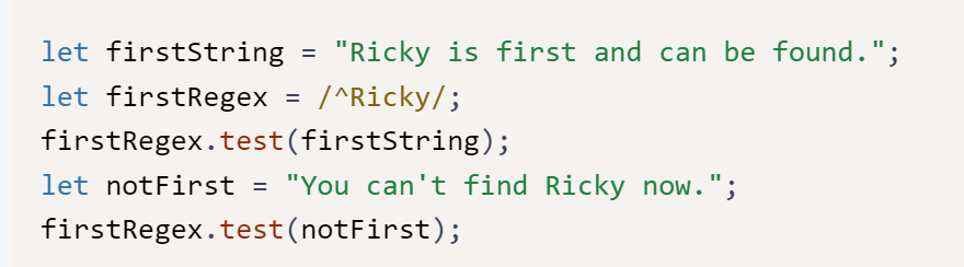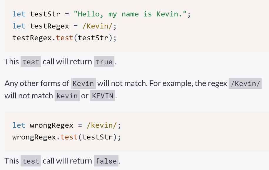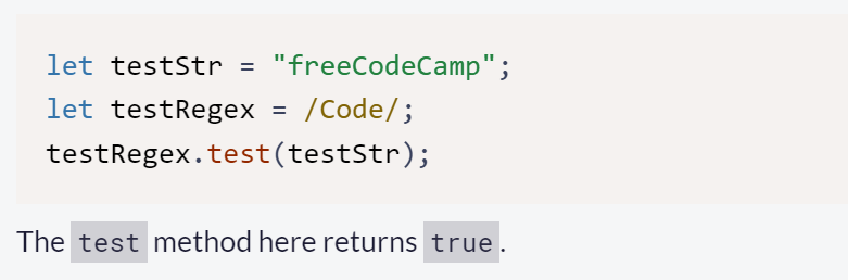 The .test() method takes the regex, applies it to a string (which is placed inside the parentheses), and returns true or false if your pattern finds something or not.