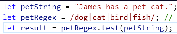 Visualise code in which the regex petRegex looks to match the pets dog, cat, bird, or fish into a string petString.