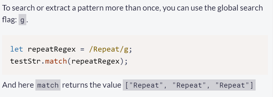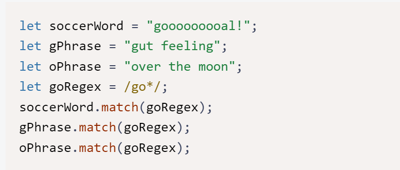 In order, the three match calls would return the values [“goooooooo”], [“g”], and null.