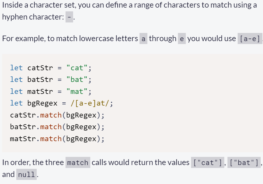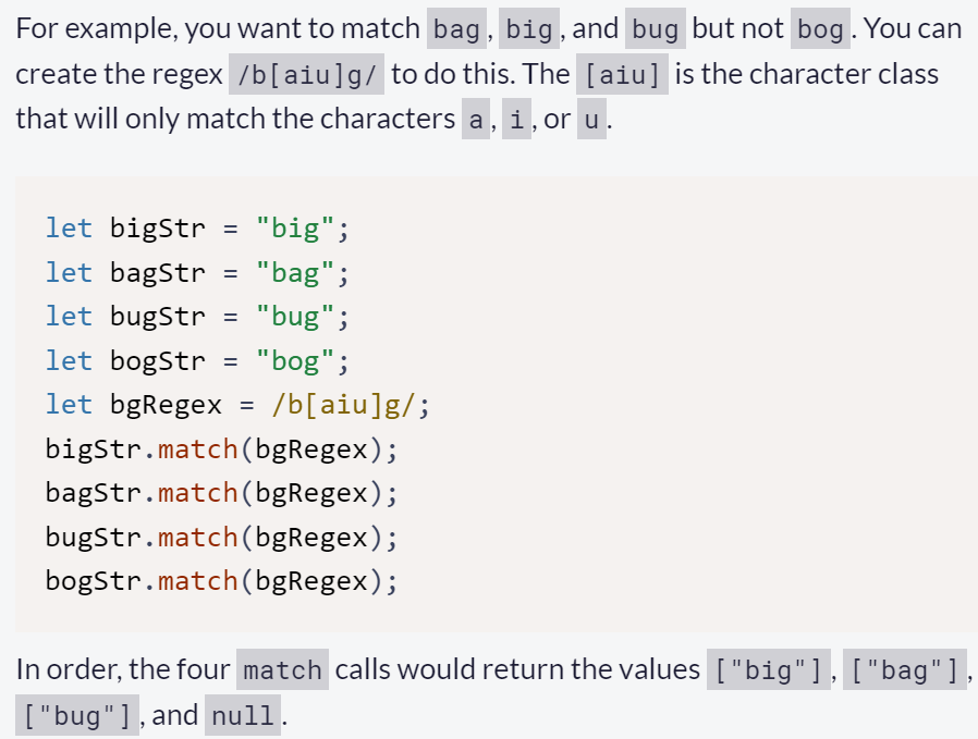 For example, /[^aeiou]/gi matches all characters that are not a vowel. Note that characters like ., !, [, @, / and white space are matched - the negated vowel character set only excludes the vowel characters.