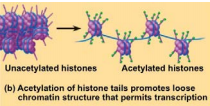 histone molecules loosen their grip on the DNA molecule when acetyl groups attach – associated with activated transcription