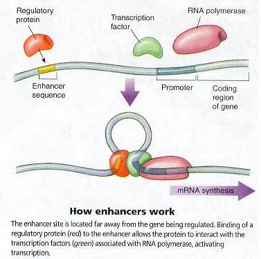 may be found either upstream or downstream to the regulatory gene; because of its distance from the “gene it influences, the DNA segment containing the enhancer folds in a way that can join the general transcription factors and RNA polymerase on the promoter” (Cliffs 139).