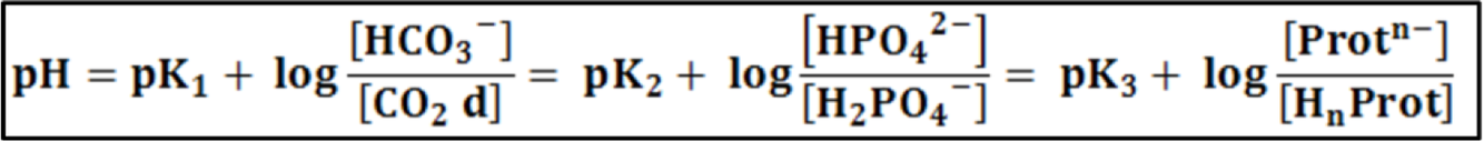 = pK2 + log([HPO<sub>4</sub><sup>2-</sup>]/[H<sub>2</sub>PO<sub>4</sub><sup>-</sup>] = pK3 + [Prot n-]/[HnProt]