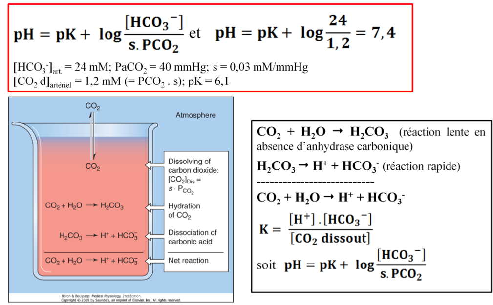 pH~ pK + log(rein/poumon)= pK + log [HCO3 -]/s.PCO2