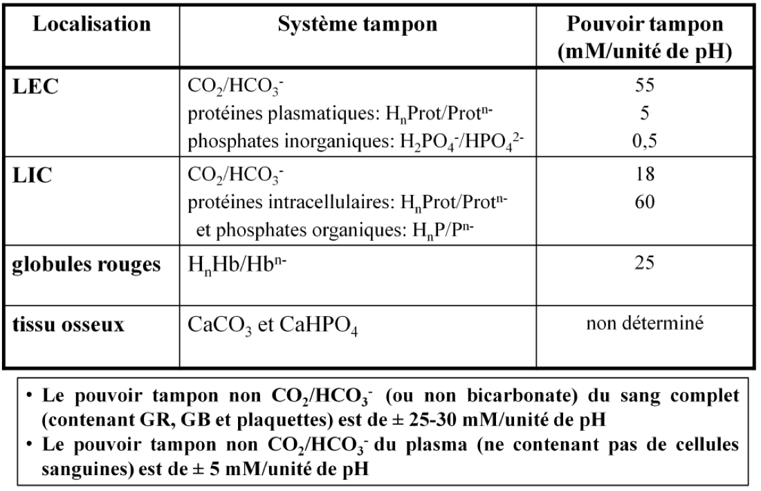 Le pH du LEC est stabilisé par 4 systèmes tampons appartenant à 2 catégories différentes: