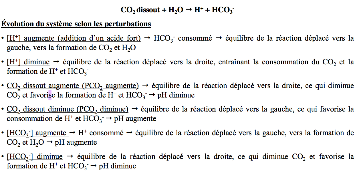 La réaction CO2dissout + H2O → H2CO3 peut être accélérée par l’anhydrase carbonique, ce qui favorise le déplacement de la réaction vers la droite.