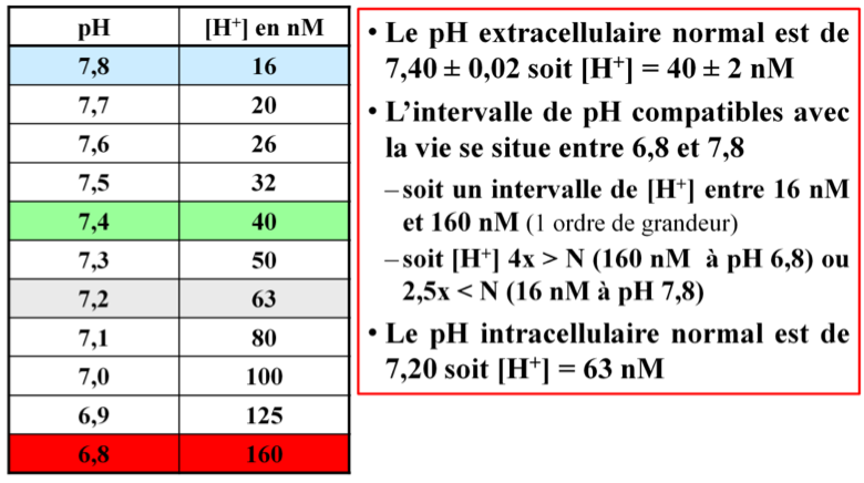 le pH du plasma est de 7,4 donc la concentration de H+ est de 40nM dans le plasma d’où 0,00056 mmoles de H+ dans le LEC (14L). La production quotidienne d’acide fixe est de 70mmoles dans le LEC soit 5mmoles/L (70/14).