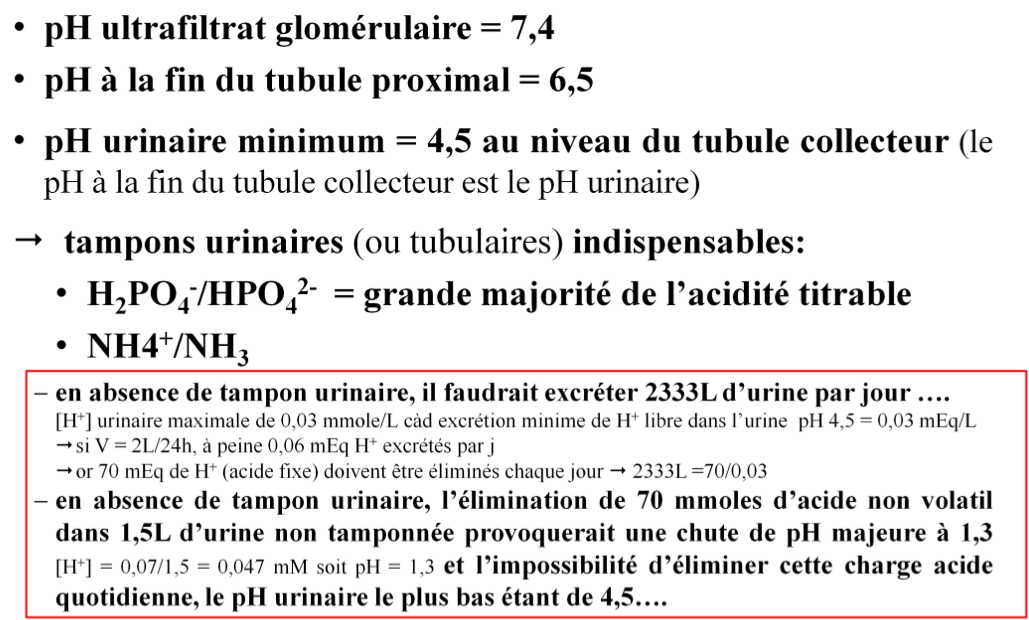 En absence de tampon urinaire, l’élimination de 70mmoles d’acide non volatil dans 1,5L d’urine non tamponnée provoquerait une chute de pH majeure de 1,3 il y aurait impossibilité d’éliminer cette charge acide quotidienne ( le pH urinaire le plus bas étant 4,5)