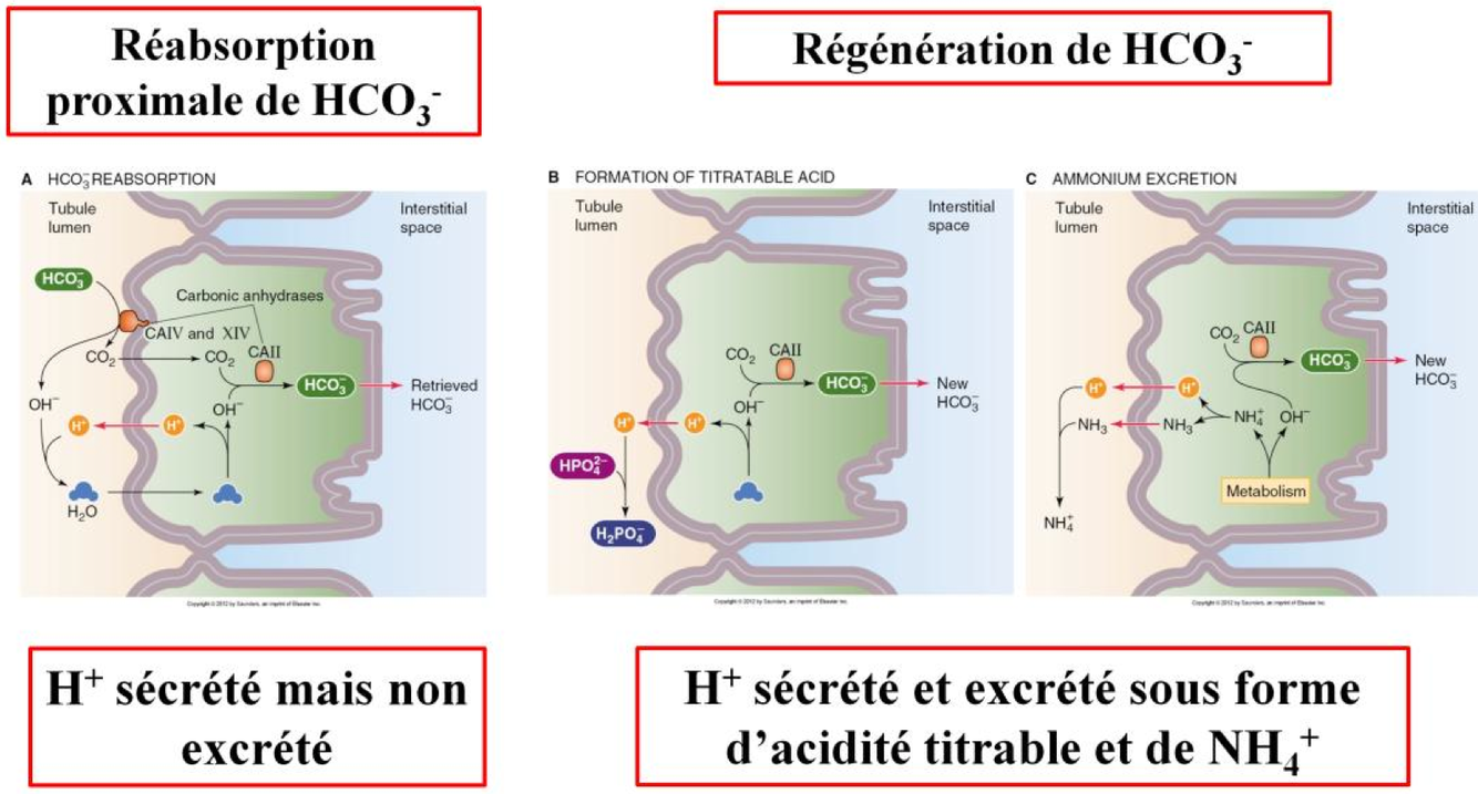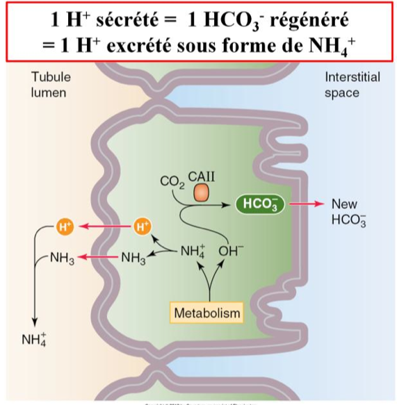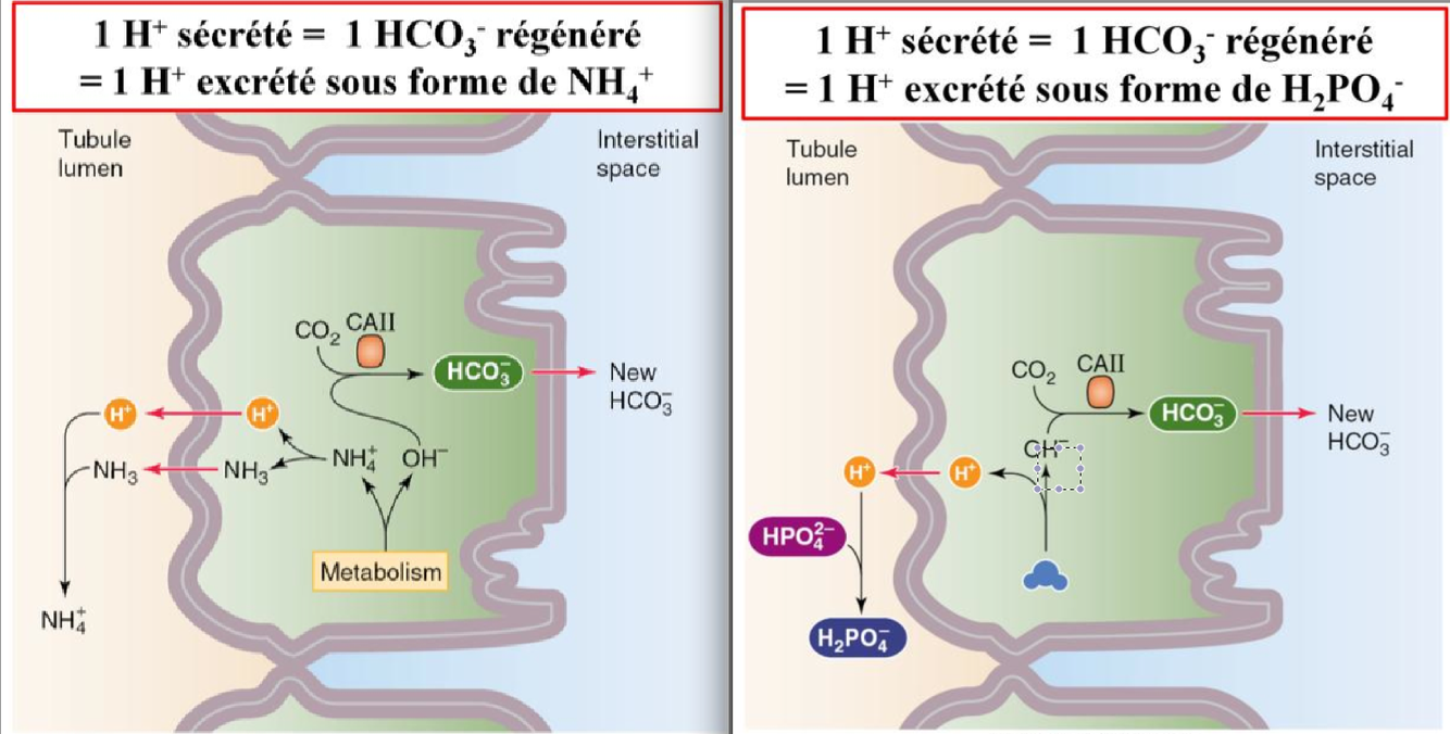 Régénération : (70 mEq/J) formation d’une nouvelle molécule de HCO3- suite à la sécrétion d’un H+ tamponné dans la lumière tubulaire par NH3 et HPO42- . On les retrouve alors excretés sous forme d’acidité titrable (H2PO4-) et de NH4+.