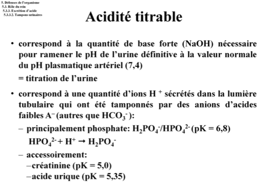 Le tampon NH4+/NH3 ne fait pas partie de l’acidité titrable car son pKa est de 9,25 et donc au pH urinaire il n’existe que sous forme de NH4+ qui peut lier le Cl- (ce qui ne modifie pas le pH urinaire) et qui est pas conséquent non titrable à pH=7,4. La forme NH3 n’est jamais présente au niveau urinaire.