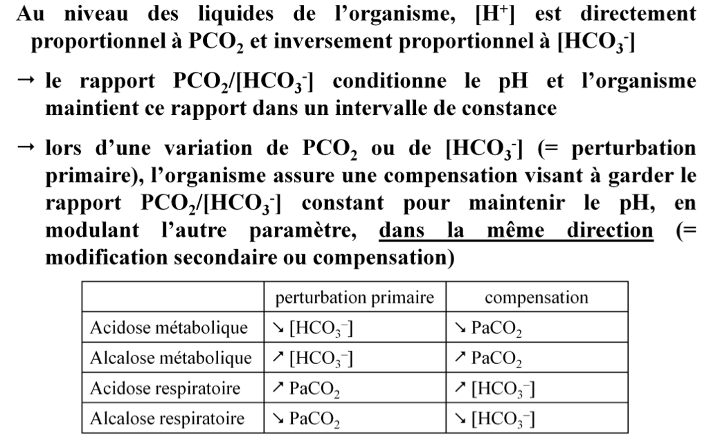 Lors d’un problème respiratoire la compensation est métabolique (rénale) et lors d’un problème rénal la compensation est respiratoire.