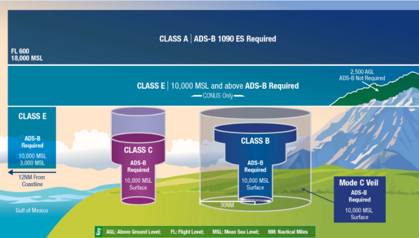 (91.225) ADS-B Out is required within class ___________ airspace, within the _______ _____ of class B, and above the ceiling within the _________ boundaries of Class B or Class C airspace up to _______.