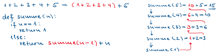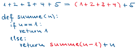 Wie sieht ein Rekurisionsbaum aus? Beispielsweise für die Berechnung der Summe der ersten 5 zahlen.