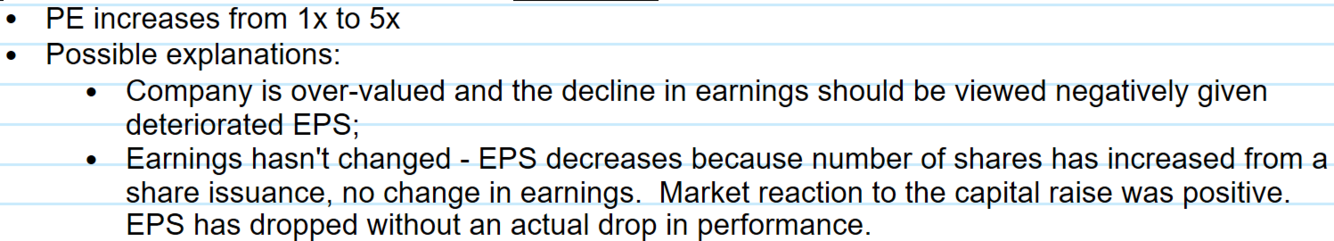 Company has share price of 10, EPS of 2 that decreases to 1 four years later. What happens to the P/E ratio and how would you interpret the result?