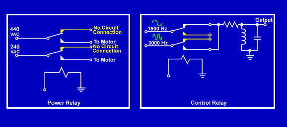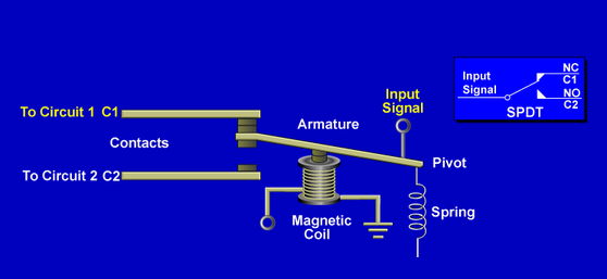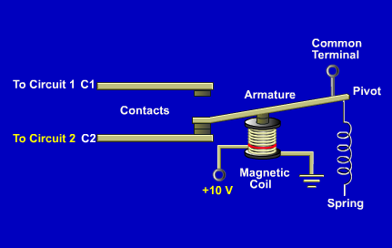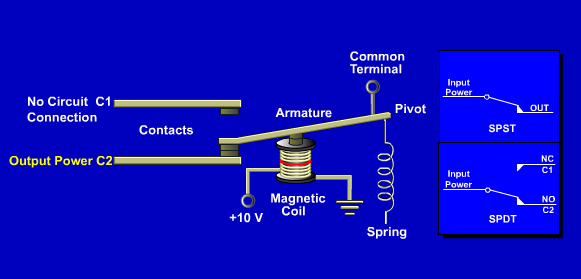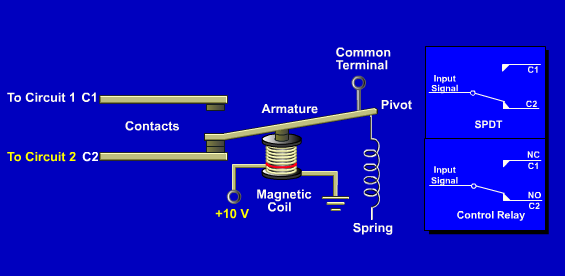 A control relay is a magnetically operated switch that directs signals. Each set of contacts is similar to asingle pole double throw (SPDT) switch.