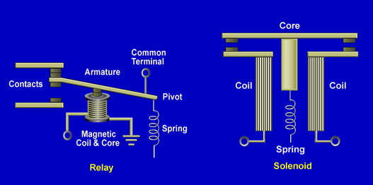 Solenoids are closely related to relays; they are also an electromagnetic switch. Solenoids are used to make electrical connections and perform mechanical functions. The difference between a relay and solenoid is that the core of a solenoid is ____ and the core of a relay is _______.