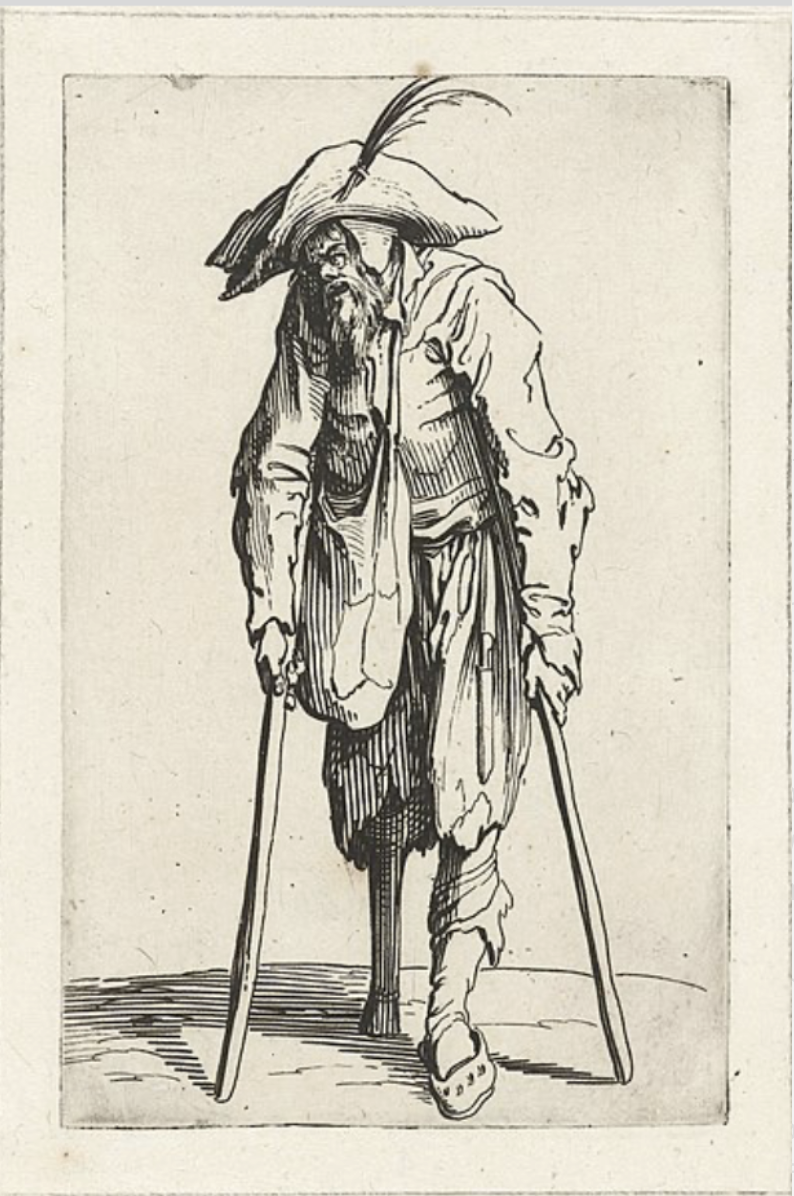 Title: Beggar with wooden leg and crutches