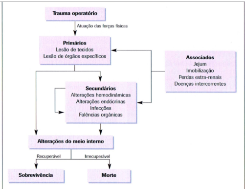 Ocorre resposta hiperglicêmica após o trauma, que decorre da estimulação hepática por catecolaminas, provocando gliconeogênese.