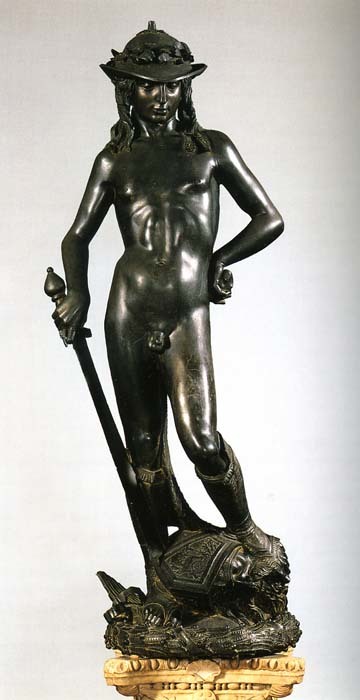 Wiing from goliath’s helmet reaches up David’s inner leg