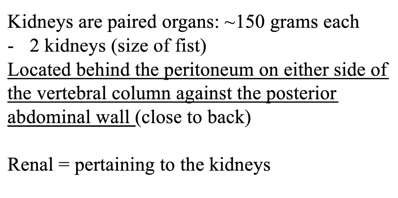 Gross anatomy of kidney (weight, location)