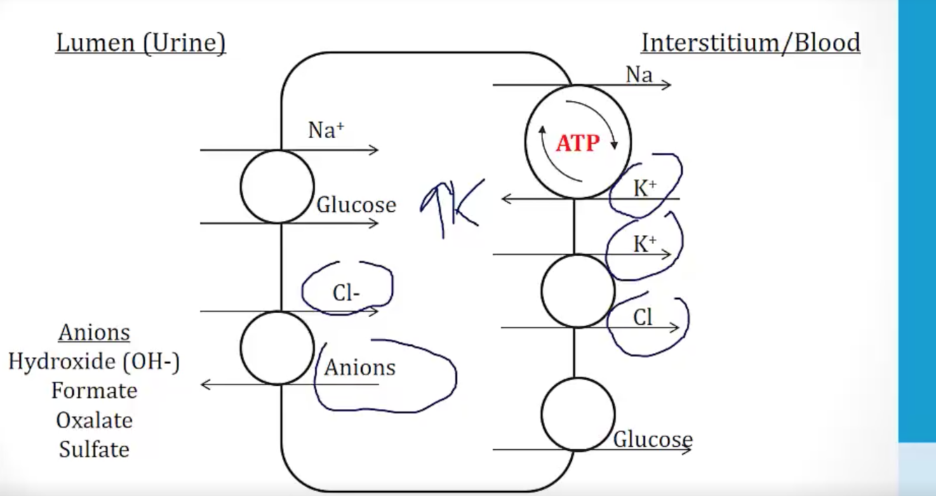 d/t the K/Cl cotransporter, the concnetration of Cl inside the cell is low, which establishes the gradient for Cl to enter via a Cl/anion antiporter, which excretes anions (OH, formate, oxalate, sulfate) into the lumen