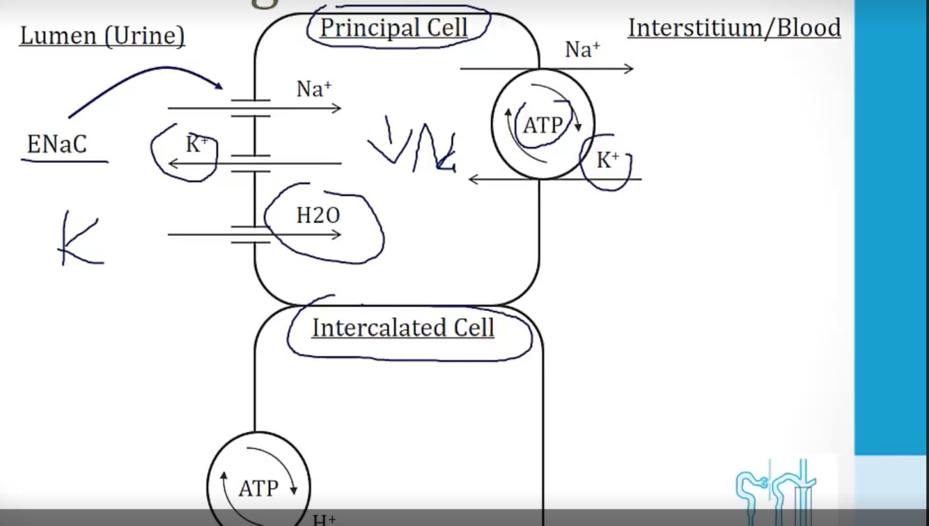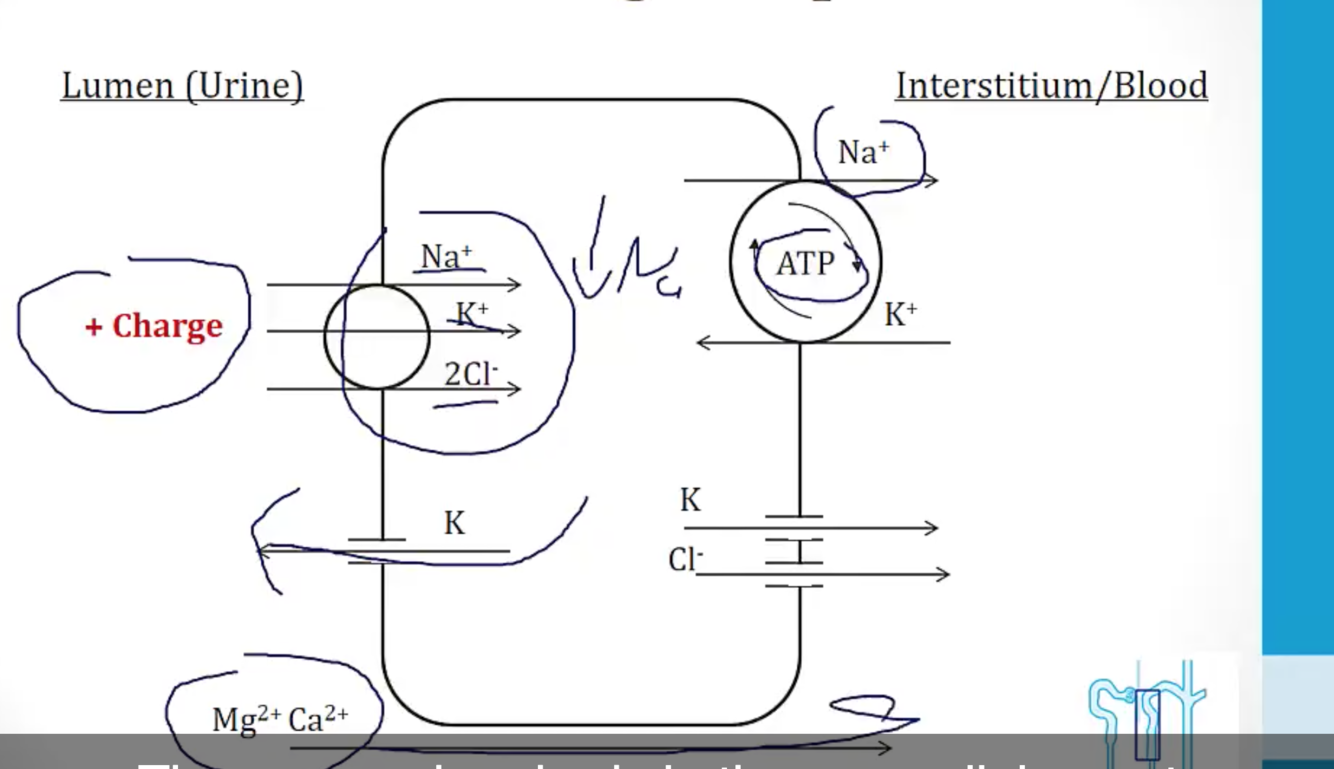 d/t the high concentration of K in the cell, some leaks out into the lumen creating a + charge in urine - this is important b/c it drives the reabsorption of other cations (Mg & Ca) via paracellular transportation & also into the blood