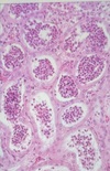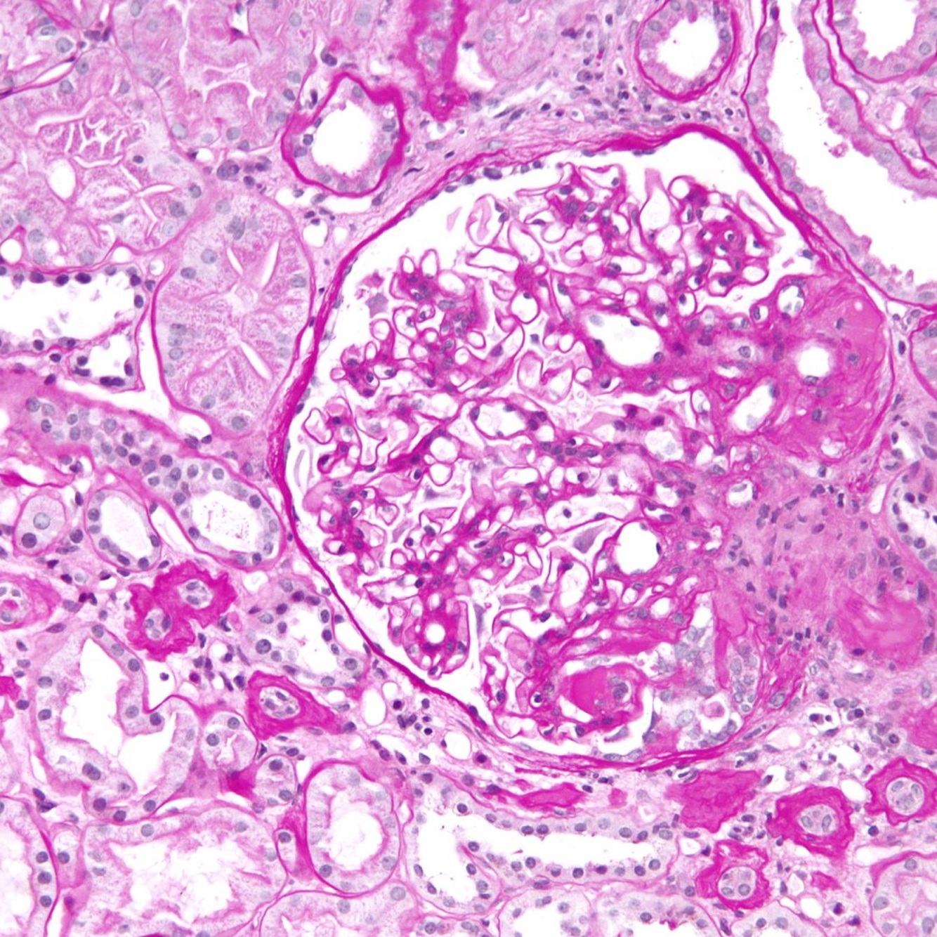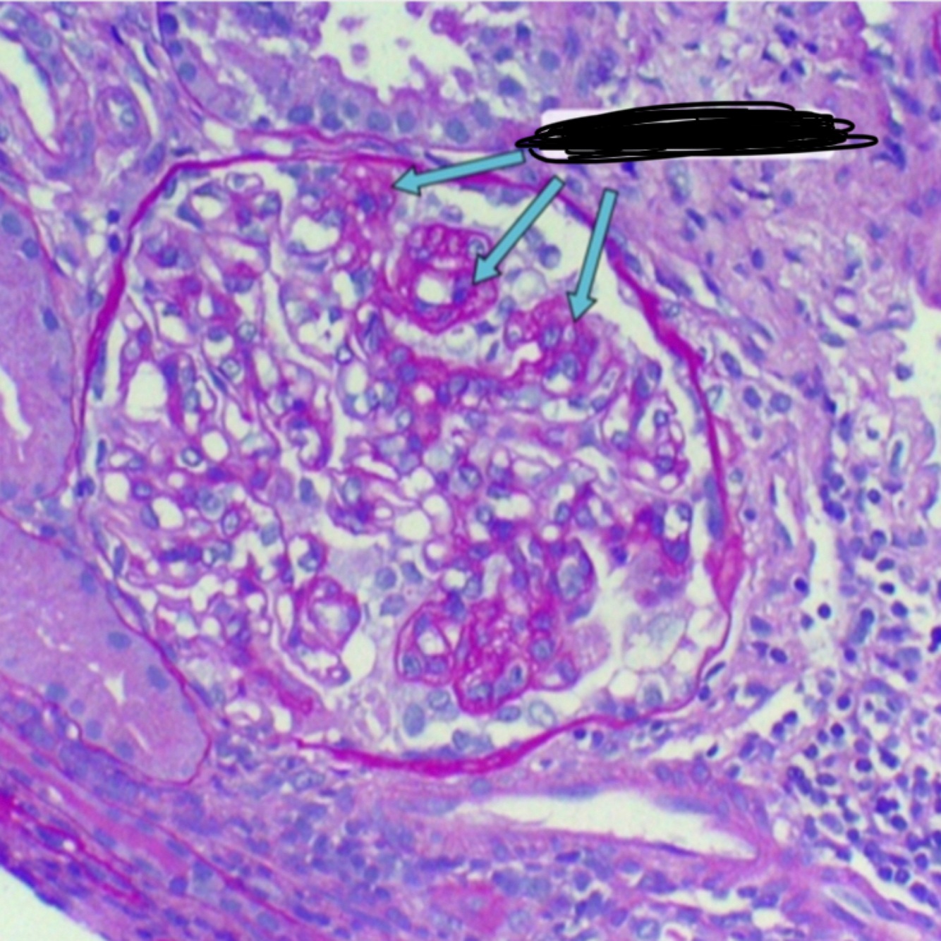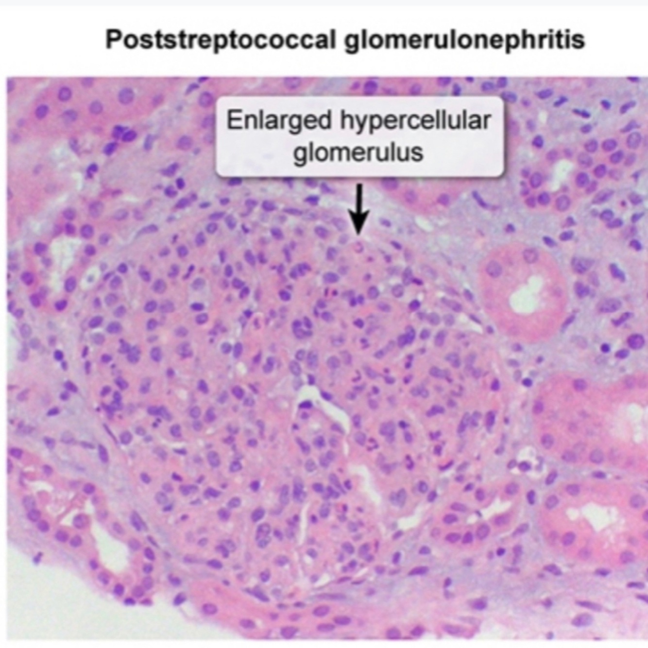 APSGN, enlarged hypercellular glomeruli, with dense subepithelial humps on the basement membrane.