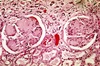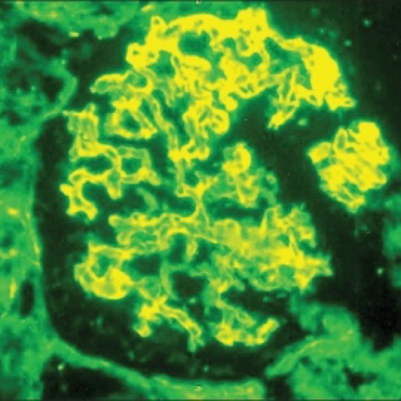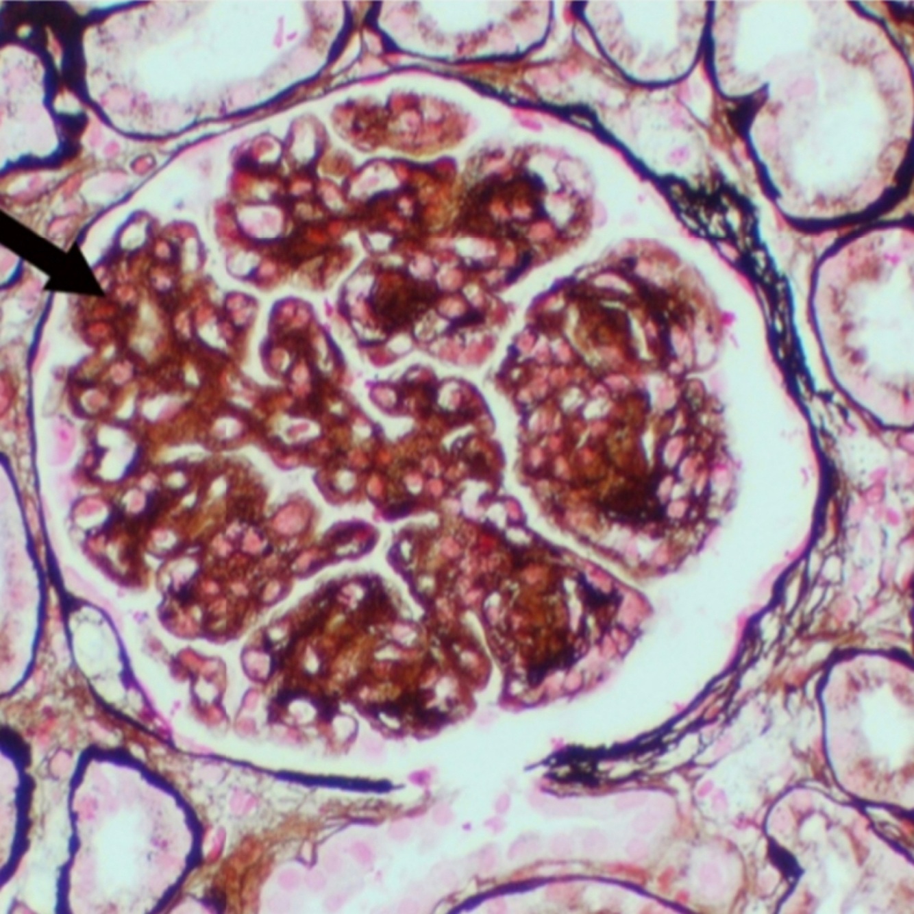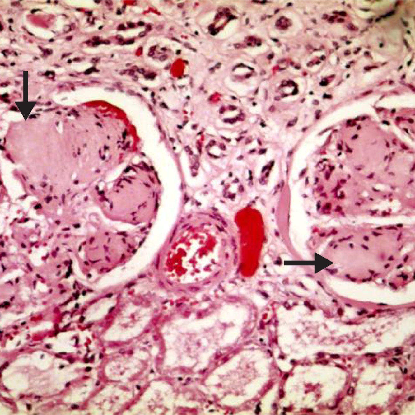 renal biopsy shows nodular sclerosis (also called Kimmelstiel-Wilson nodules), which is characteristic of advanced diabetic nephropathy