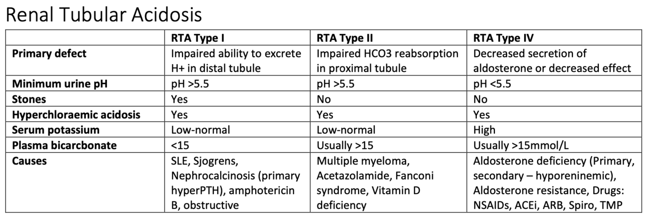 Compare types of renal tubular acidosis