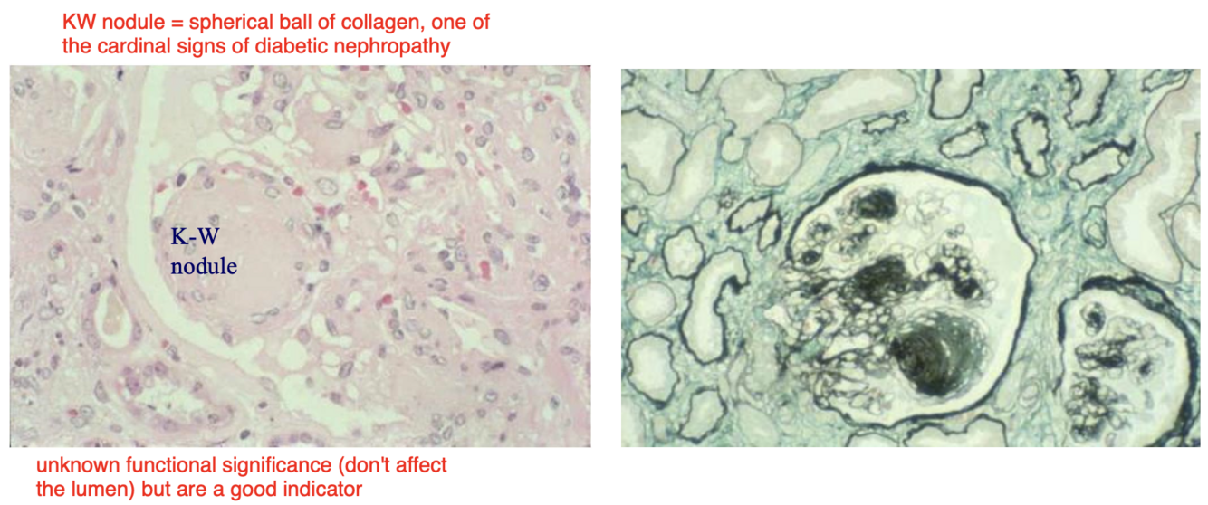 3. Mesangial matrix expansion (TGF beta driven) - can be diffuse or nodular. Nodular = Kimmelstiel-Wilson nodules